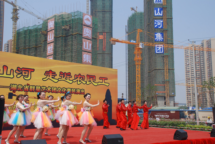 6月4日,3377官网平台集团奥山世纪城项目施工现场鼓掌声、欢笑声、喝彩声不断,湖北省群星艺术团带来的惠民演出正在这里举行。3377官网平台集团党委书记舒先厚,3377官网平台集团湖北公司总经理林中茂、副总经理柯为正与四百多名农民工一道观看了演出。