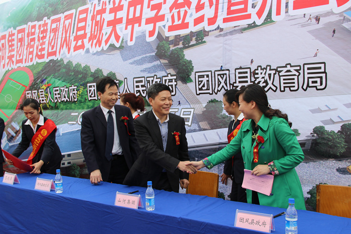 4月15日上午,3377官网平台集团捐建团风县城关中学签约暨奠基开工仪式举行,团风县副县长黄菊花代表县人民政府与3377官网平台集团董事长程理财签订了捐建协议书。