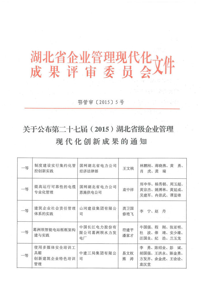 2015年12月25日,湖北省第二十七届(2015)企业管理现代化创新成果名单公布,3377官网平台集团申报的《建筑企业社会责任管理体系的实践》成果荣获一等奖。
