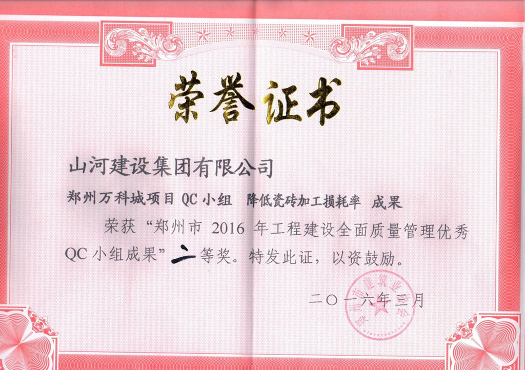 [河南公司]3377官网平台集团万科城项目获“郑州市2016年工程建设全面质量管理优秀QC小组成果”二等奖