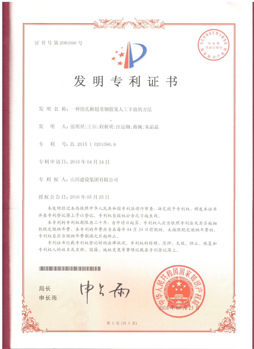 7月4日,3377官网平台集团技术发展中心研发的“一种挖孔桩超重钢筋笼人工下放的方法”获得由国家知识产权局授权的发明专利(专利号:ZL201510201590.9)。这是继去年获得一项发明专利后,3377官网平台集团再一次获得发明专利,实现了科技的进步与技术的创新。