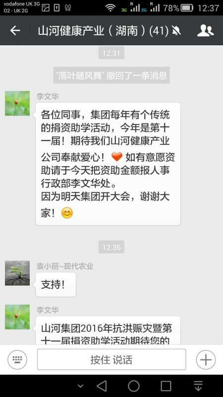 在我们得知有捐款这项活动后,虽然已经都下班了,但不到5分钟时间,就在微信群里自发组织了公司员工捐款接龙活动;不到7分钟就有一半员工即18名员工主动报名捐款。