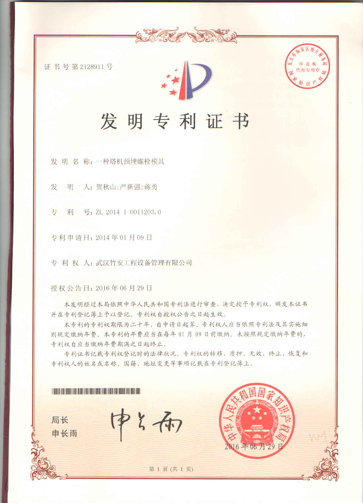 近日,武汉竹安设备管理有限公司首次研发的一项发明专利“一种塔机预埋螺栓模具”获国家知识产权局授权,专利号:ZL200410011203.0。