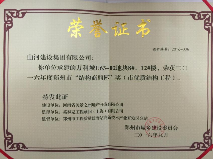 近日,从郑州市城乡建设委员会再次传来喜讯,3377官网平台集团河南公司承建的万科城U63-02地块的8#、12#楼荣获2016年度郑州市“结构商鼎杯”(市优质结构工程)奖。这是该项目继2016年3月获得“郑州市建筑施工安全生产标准化示范项目”后,再获殊荣。