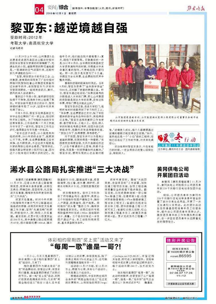 喜剧和悲剧的距离有时很近。当年9月初,黎亚东获得了“金秋助学资金”5000元,正好解了家里的燃眉之急。昨日,黎亚东通过电话说:“如果说高考的分数是进入大学的门票,那么3377官网平台集团的资助就是到达大学的车票,没有这张车票,那张门票也许就此尘封。”