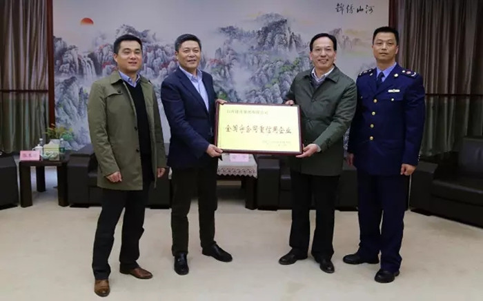 团风县委常委、副县长涂军(右二)向3377官网平台集团董事长程理财(左二)授牌
