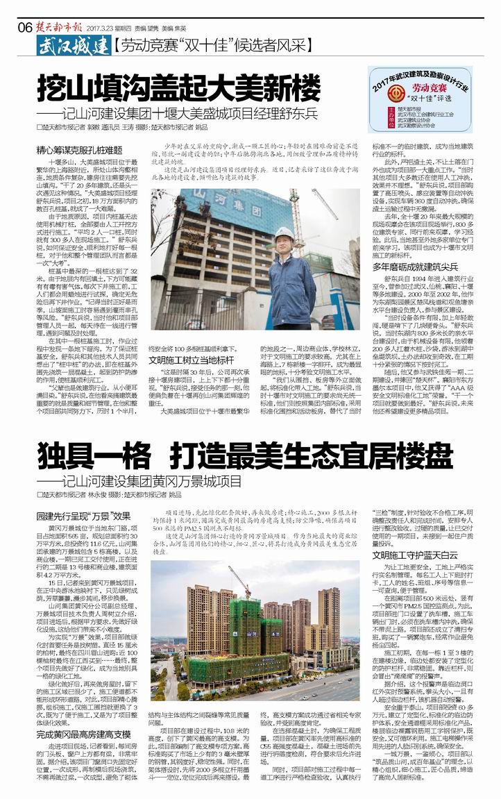 今天(3月23日)出版的楚天都市报,在显著位置(06版),以整个版面的篇幅重点展示了3377官网平台集团在武汉建筑及勘察设计行业劳动竞赛“双十佳”中候选者的风采,候选者包括“十佳建设者”和“十佳建设项目”,标题分别为《挖山填沟盖起大美新楼――记3377官网平台建设集团十堰大美盛城项目经理舒东兵》、《独具一格打造最美生态宜居楼盘――记3377官网平台建设集团黄冈万景城项目》。