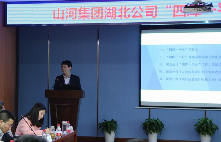 会上,湖北公司 “四库一平台”工作小组组长王涛传达了“四库一平台”相关文件,并对具体工作进行了演练和详细讲解。湖北公司常务副总经理、“四库一平台”领导小组组长詹必强指出,“四库一平台”一旦联网启动后,各项目部人员信息就会与全国社保系统实现互联互通,通过身份证可以查人员,通过单位名可以查人员,通过人员也可以查单位。目前,湖北公司预入“四库一平台”的项目有138个,任务繁重,各项目部要全力配合完成《人员信息表》、《项目信息表》等相关资料的收集、填报,并保证资料真实有效,确保工程项目标准化、规范化运行。他要求,通过“四库一平台”建设,公司管理人员、项目经理要努力提升管理水平,采取有效措施,吸引人才、打造人才,保证人才队伍既能满足资质动态核查的要求;项目班子要切实加强履约效能,做到施工全过程管理,每项工程,无论其大小,都要确保规范化、标准化、程序化、合规合法经营。