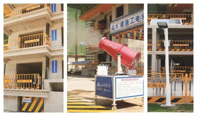标准化的绿色施工。为减少扬尘污染,项目部进行大面积绿化,同时还对施工道路、车辆定期进行冲洗处理,建立了楼层垃圾清运管道系统、外架喷淋系统,使用防尘雾炮抑尘,施工用水进行循环利用等。