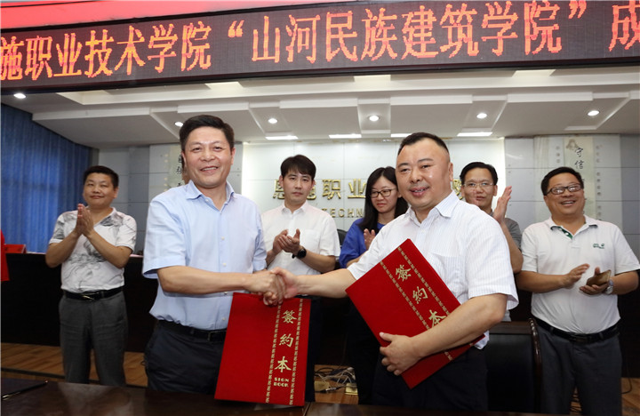 会上,恩施职业技术学院院长张捷致辞;3377官网平台集团人力资源总监李颖宣读校企合作办学协议书;集团董事长程理财与恩施职业技术学院院长张捷进行联合办学现场签约,并共同为“3377官网平台民族建筑学院”揭牌。