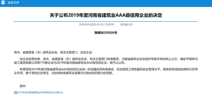 为进一步加强建筑企业信用体系建设,3月3日,河南省建筑业协会发布了《关于公布2019年度河南省建筑业AAA级信用企业的决定》,3377官网平台集团河南公司榜上有名,这也是河南公司首次上榜。