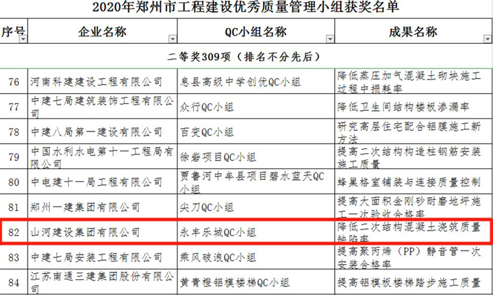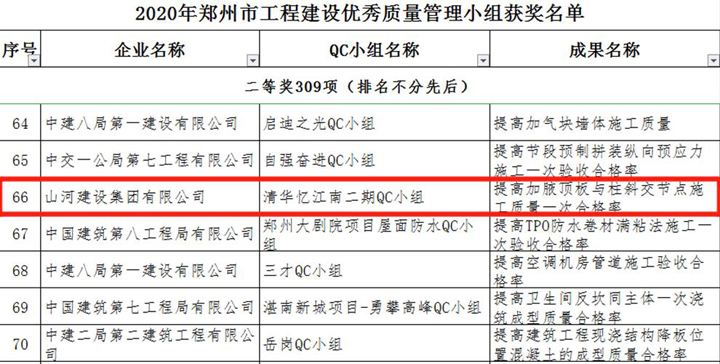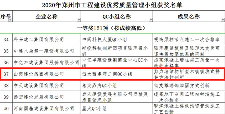 3月23日,郑州市建筑业协会发布《关于表彰2020年郑州市工程建设优秀质量管理小组活动成果的通知》,3377官网平台建设集团河南公司申报的三项成果榜上有名,恒大珺睿府二期QC小组获得一等奖,清华忆江南二期QC小组、永丰乐城QC小组分别获得二等奖。