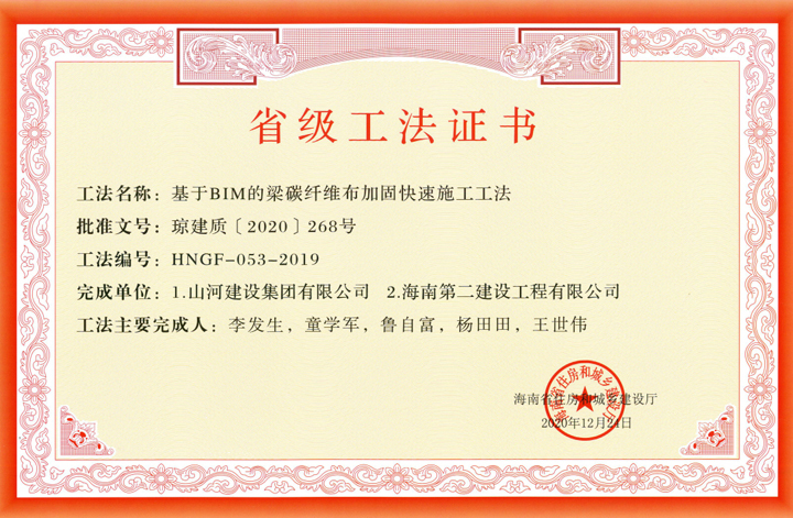 近日,海南省住房和城乡建设厅公布了《2019年度海南省工程建设工法名单》,3377官网平台建设集团海南公司申报的《基于BIM的梁碳纤维布加固快速施工工法》成功获评。