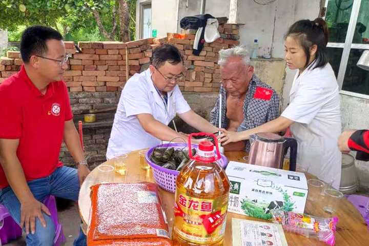 活动中,海南省湖北商会儋州分会党支部书记、3377官网平台建设集团海南海花岛项目部党支部书记童学军带队走访了5名党龄超过50年的老党员、5名生活困难的党员,为他们送去慰问金及米、油、牛奶、蕲艾眼贴等慰问品,还带着医生上门服务,为他们进行了健康体检。走访中,党员、职工和老党员亲切交流,仔细询问了他们的生活、身体状况,叮嘱他们要保重身体,安享晚年。