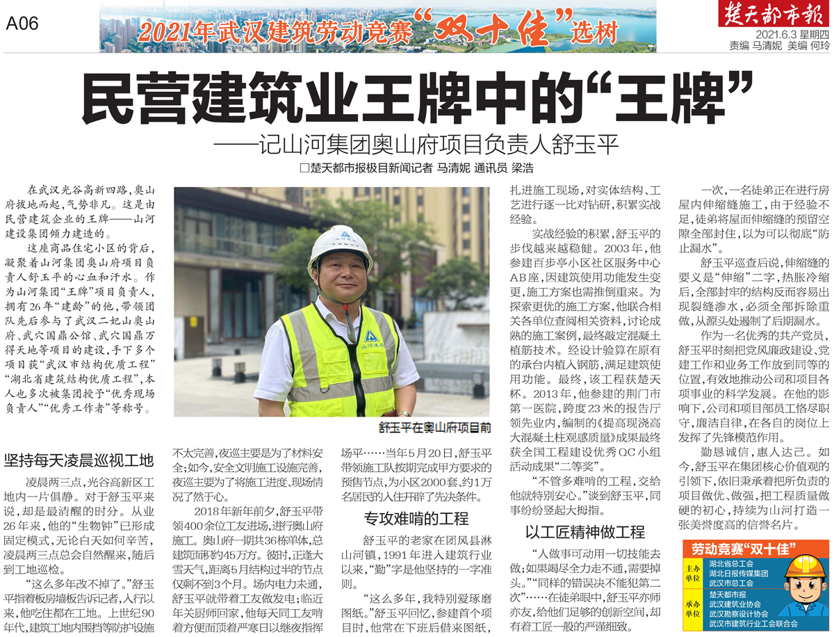 实战经验的积累,舒玉平的步伐越来越稳健。2003年,他参建百步亭小区社区服务中心AB座,因建筑使用功能发生变更,施工方案也需推倒重来。为探索更优的施工方案,他联合相关各单位查阅相关资料,讨论成熟的施工案例,最终敲定混凝土植筋技术。经设计验算在原有的承台内植入钢筋,满足建筑使用功能。最终,该工程获楚天杯。2013年,他参建的荆门市第一医院,跨度23米的报告厅领先业内,编制的《提高现浇高大混凝土柱观感质量》成果最终获全国工程建设优秀QC小组活动成果“二等奖”。