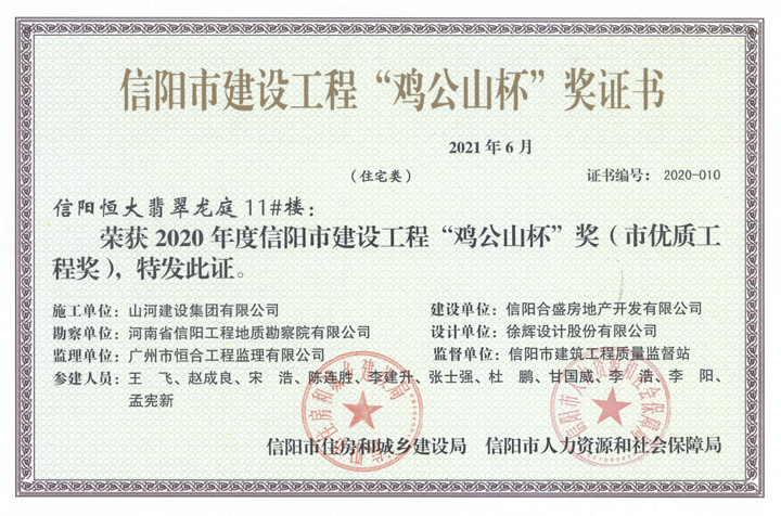 [河南公司]3377官网平台集团河南公司恒大翡翠龙庭项目荣获信阳市“鸡公山杯”奖