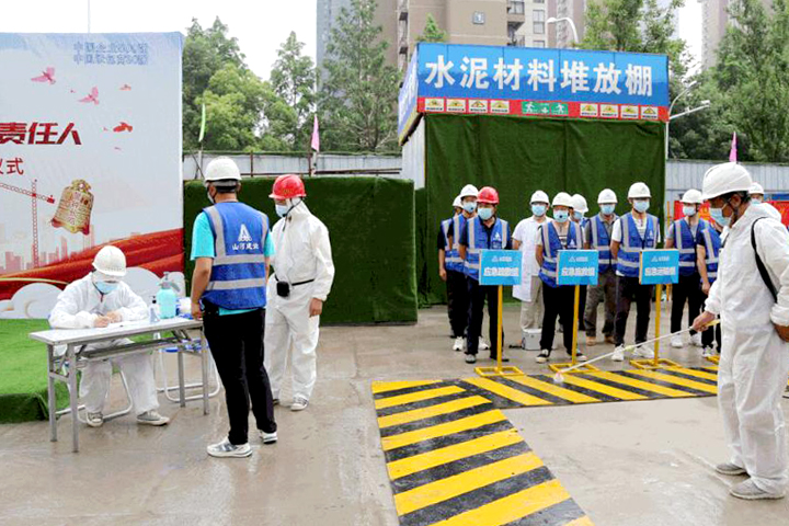 防疫部门工作人员抵达现场,并将发热人员转运至医院后,项目部立即封锁大门,排查密切接触人员并安排隔离观察,防疫演练结束。