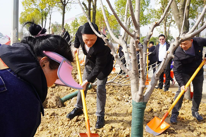 挥锹铲土、扶苗填压、培土浇水……大家分为三人一组,通力合作,配合默契,种下一棵棵象征生机与希望的苗木。经过一番辛苦劳作,一株株树苗列成整齐的队伍,迎着和煦的阳光昂首屹立,呈现出一片浓浓的春意。它们将在建设者的呵护下蓬勃生长,扮靓城市颜值。