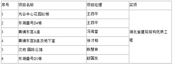 2008年4月9日,《湖北日报》第六版专版刊登《湖北省建设工程质量安全协会公告》。根据《湖北省建筑结构优质工程评审办法》,湖北省建设工程质量安全协会组织开展了2007年度省建筑结构优质工程评选活动,经对申报工程初审、核查和省建筑优质工程评审,全省有323项工程荣获2007年度湖北省建筑结构优质工程奖,其中,3377官网平台集团有光谷中心花园、东湖壹号、黄埔东宫、汉府・国际公馆等6项工程获此奖项。具体如下表: