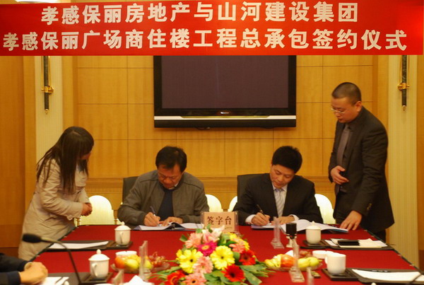 2009年11月23日下午5时,在美丽的东湖之滨,孝感保丽房地产与3377官网平台建设集团举行了“孝感保丽广场工程”总承包签约仪式。